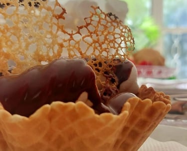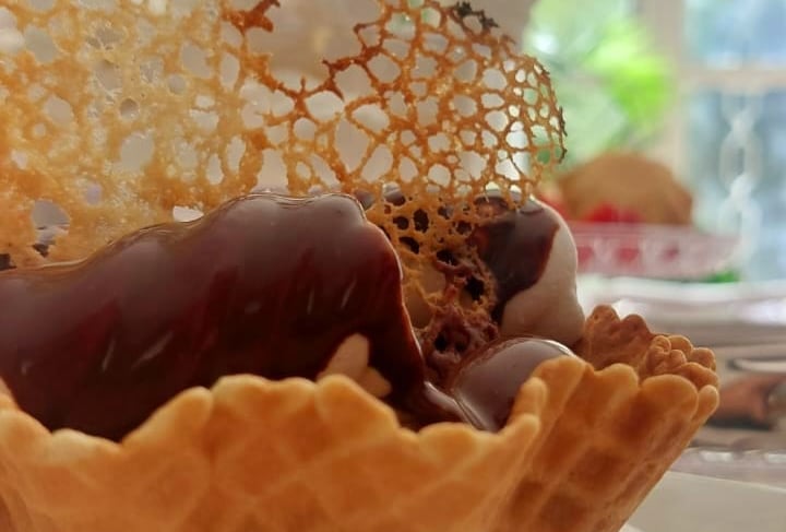 Cestinha de wafer, morango, uva verde, abacaxi cristalizado, marshmallow da Fini, tuile artesanal e chocolate.