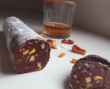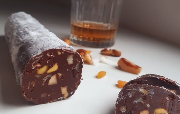 Salame de chocolate com de mix de castanhas, amêndoas e frutas secas.