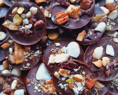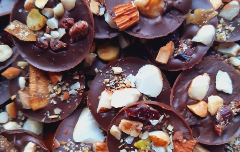 Medalhas de chocolate cravejadas de mix de castanhas, amêndoas e frutas secas.