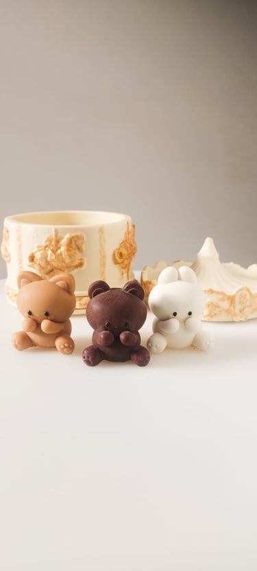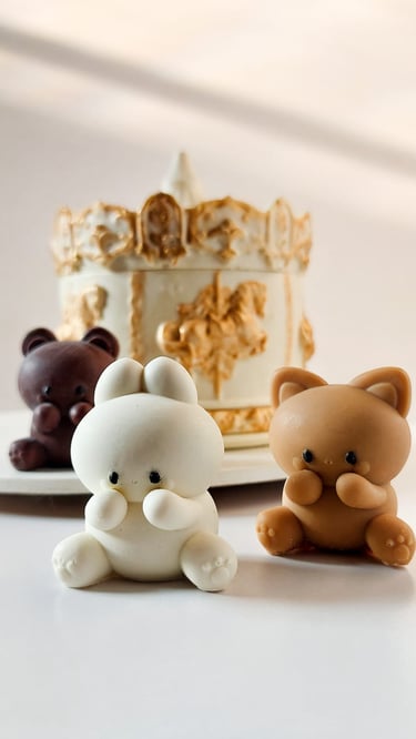 Em seu interior, há um gatinho, um coelhinho e um urso de chocolate.