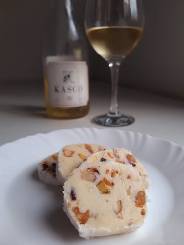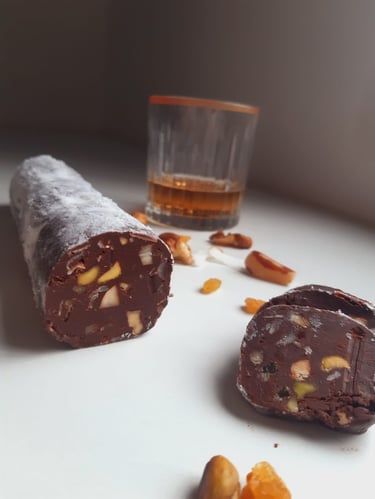 O salame de chocolate, tem o formato igual ao do tradicional: cilíndrico e comprido.